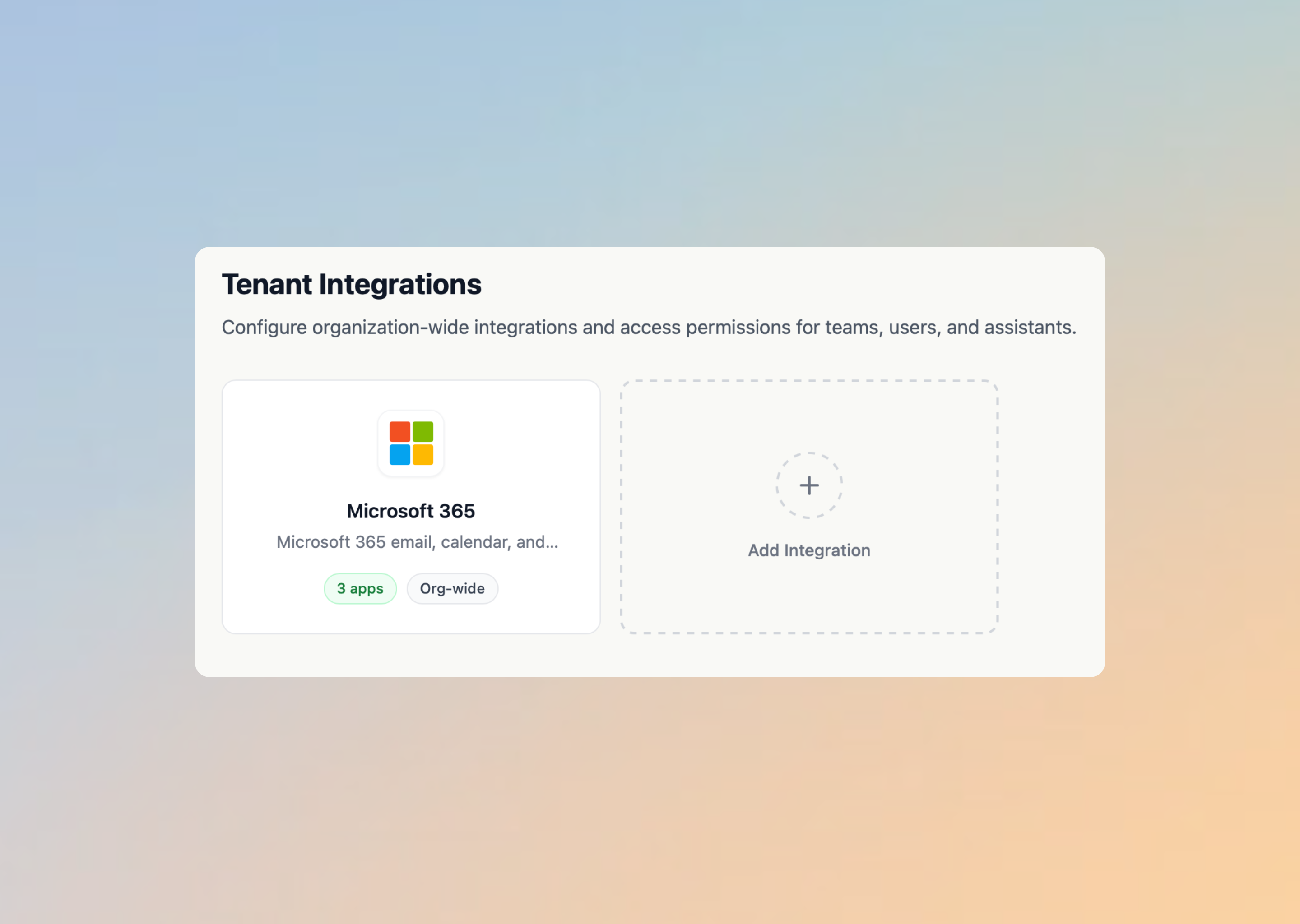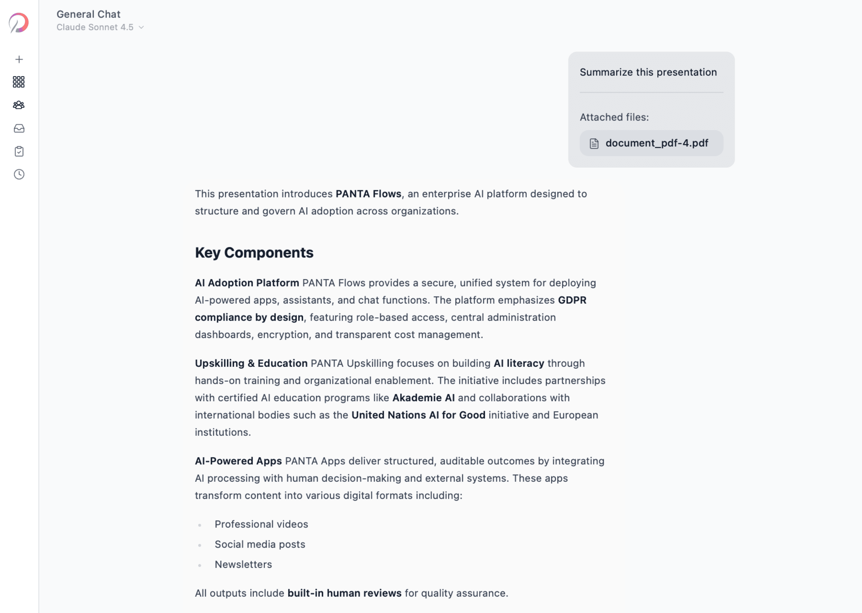 Native connections to Microsoft 365, Google Workspace, Notion, Slack, and CRM systems. Support for legacy systems via API and MCP protocol. Every feature on the platform is also available programmatically through the PANTA Flows API.