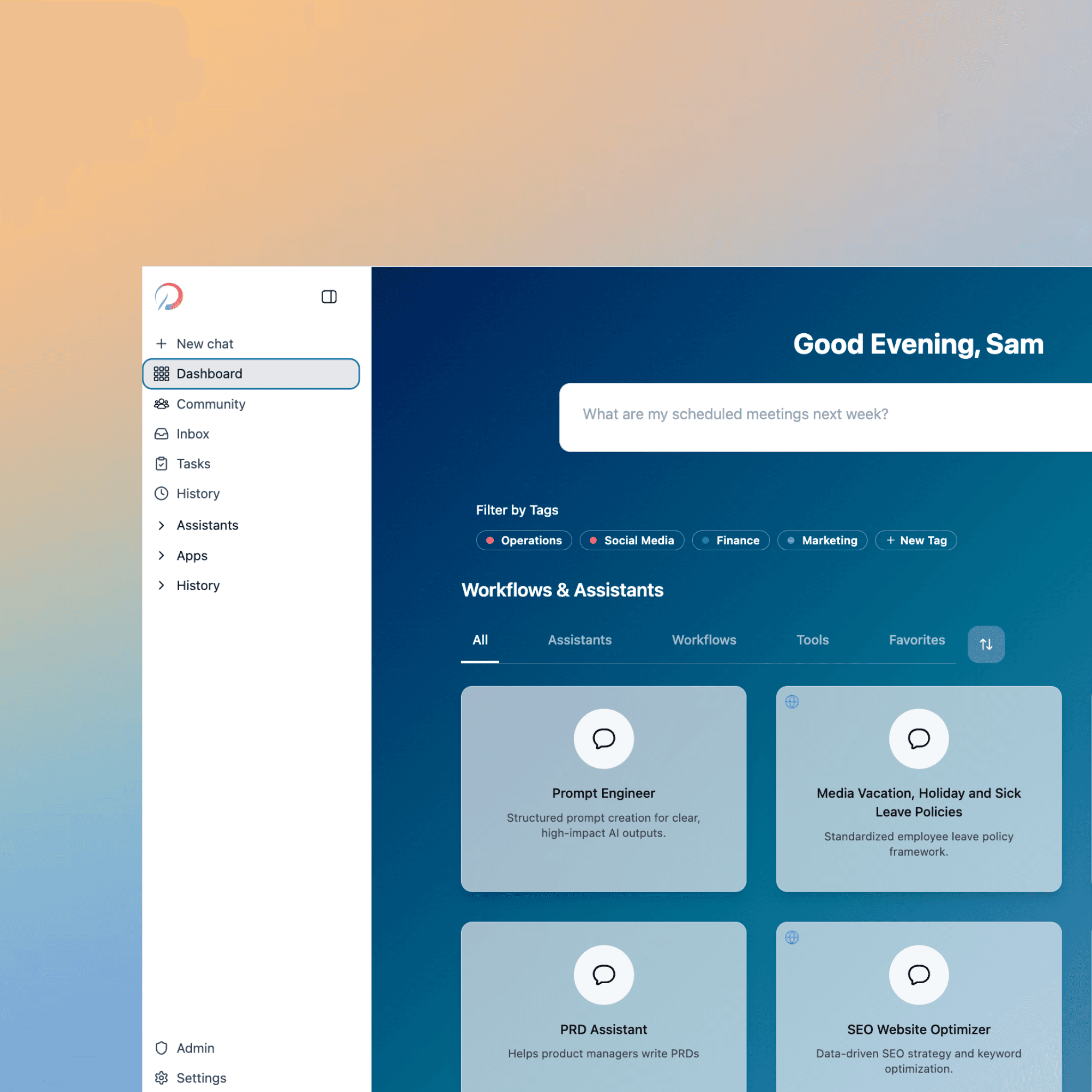 One platform for AI-powered chat, assistants, and Business Process Engines. Built for teams that need results, not experiments.